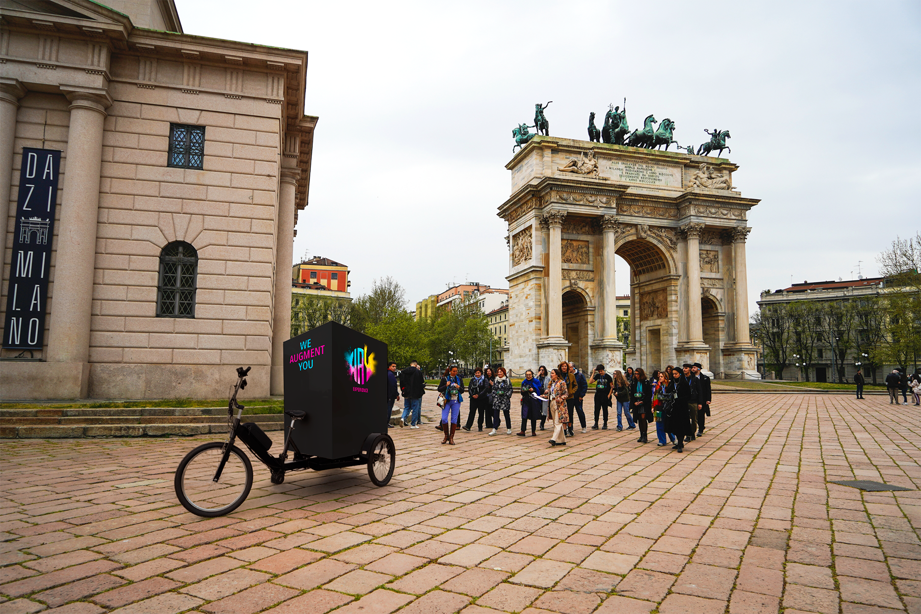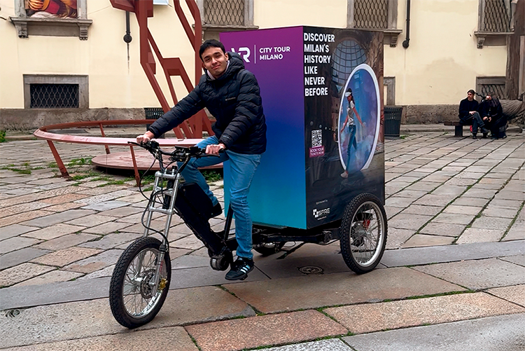Oggi, per trasportare i visori VR e le attrezzature necessarie, scegliamo un modo più responsabile: due cargo bike a pedalata assistita che collegano la nostra sede di Lambrate ai punti di partenza dei tour in centro città.